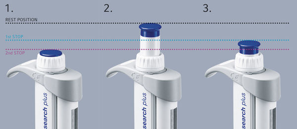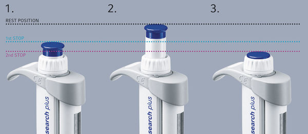 對于粘性或發泡液體以及非常小的體積,建議進行反向移液。在**步驟中另外吸出吹出體積并留在移液管**中以便丟棄。